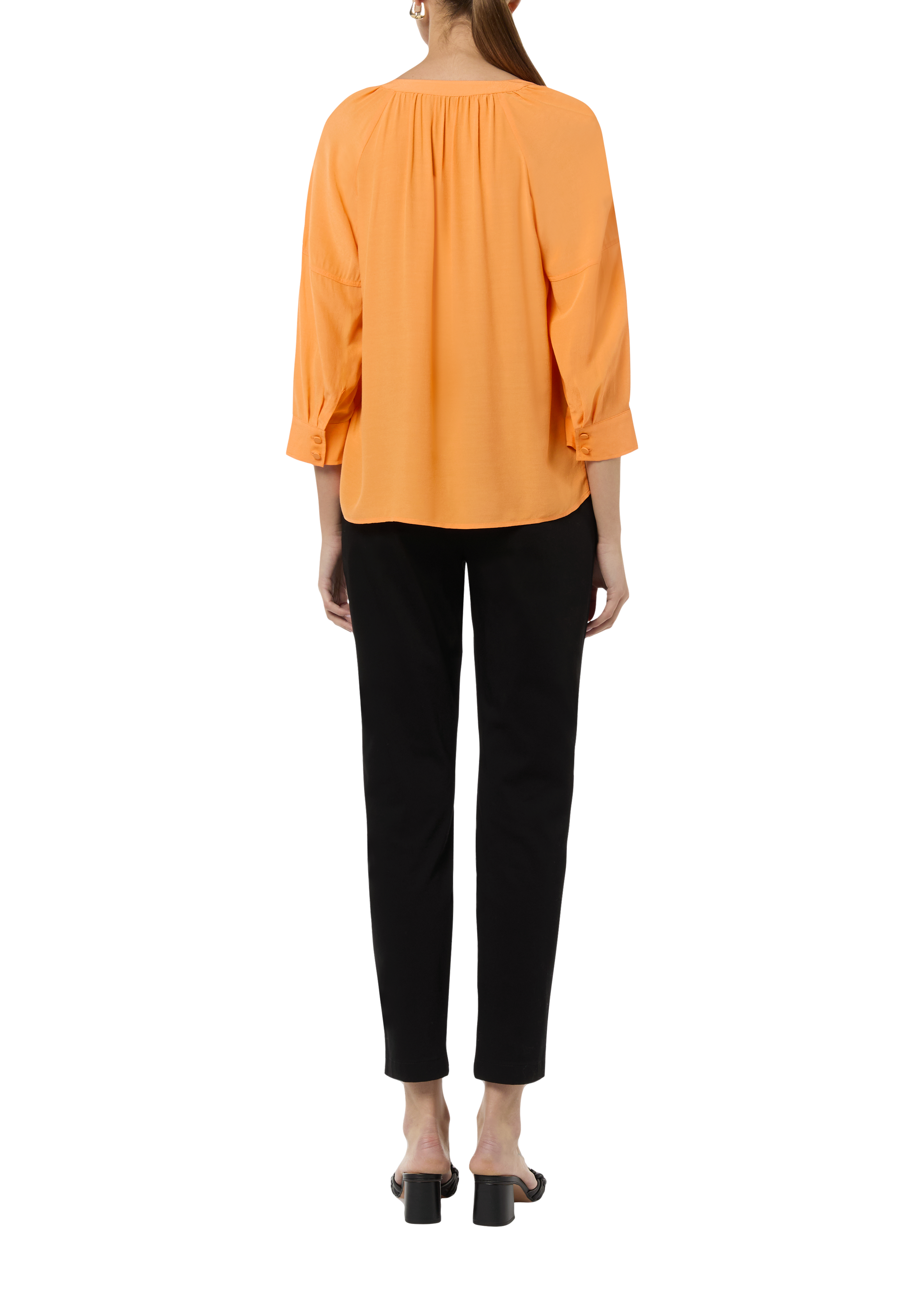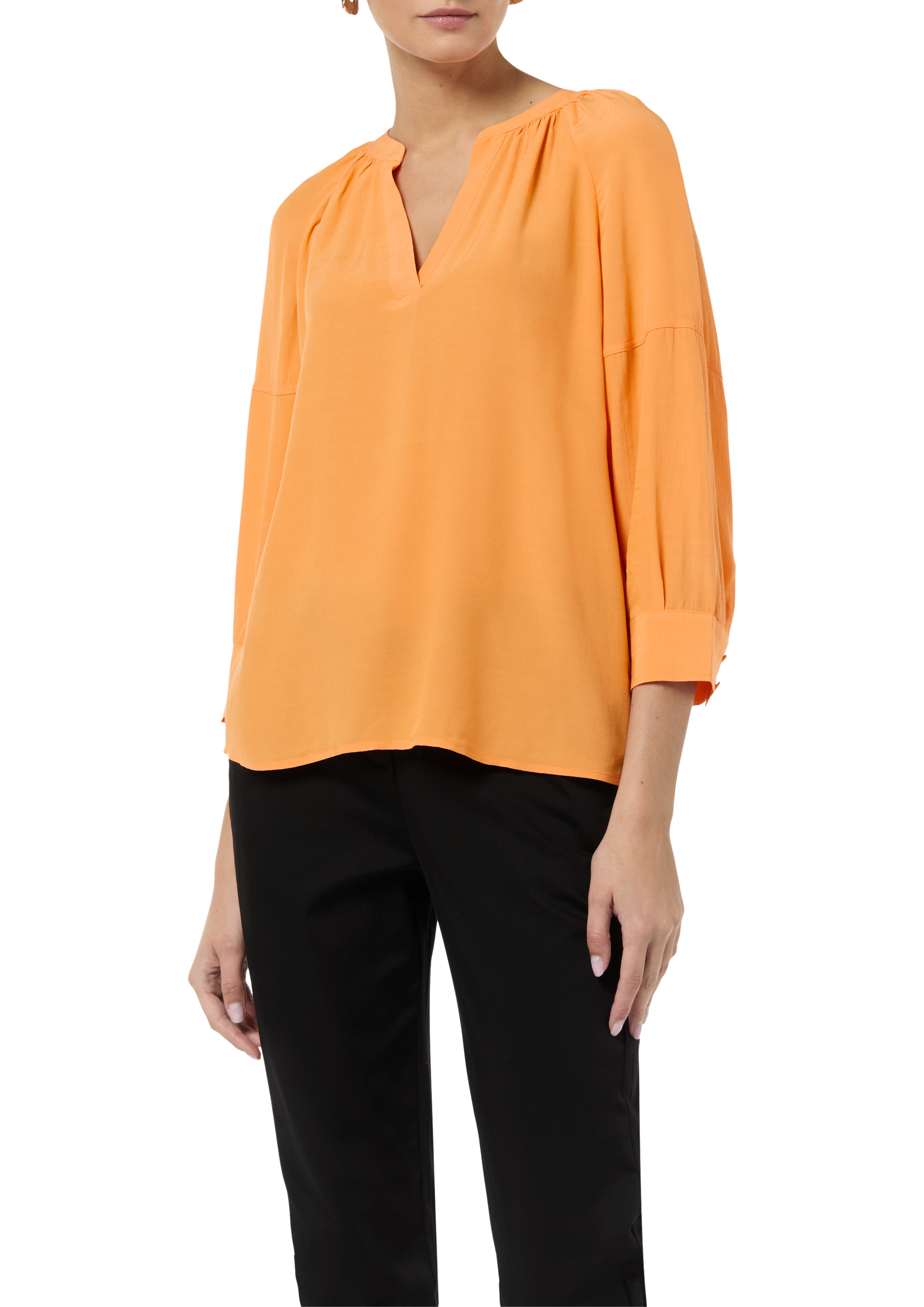 Sommerliche Leichtigkeit in Perfektion: Diese Bluse aus feiner Crêpe-Viskose umspielt Ihre Silhouette gekonnt. Der V-Ausschnitt und die 3/4-Ärmel verleihen Ihnen eine feminine Ausstrahlung. Dank des Regular Fits lässt sich die Bluse vielseitig stylen – von lässig mit Jeans bis elegant für Business-Anlässe. Der Stehkragen rundet das Design stilvoll ab.