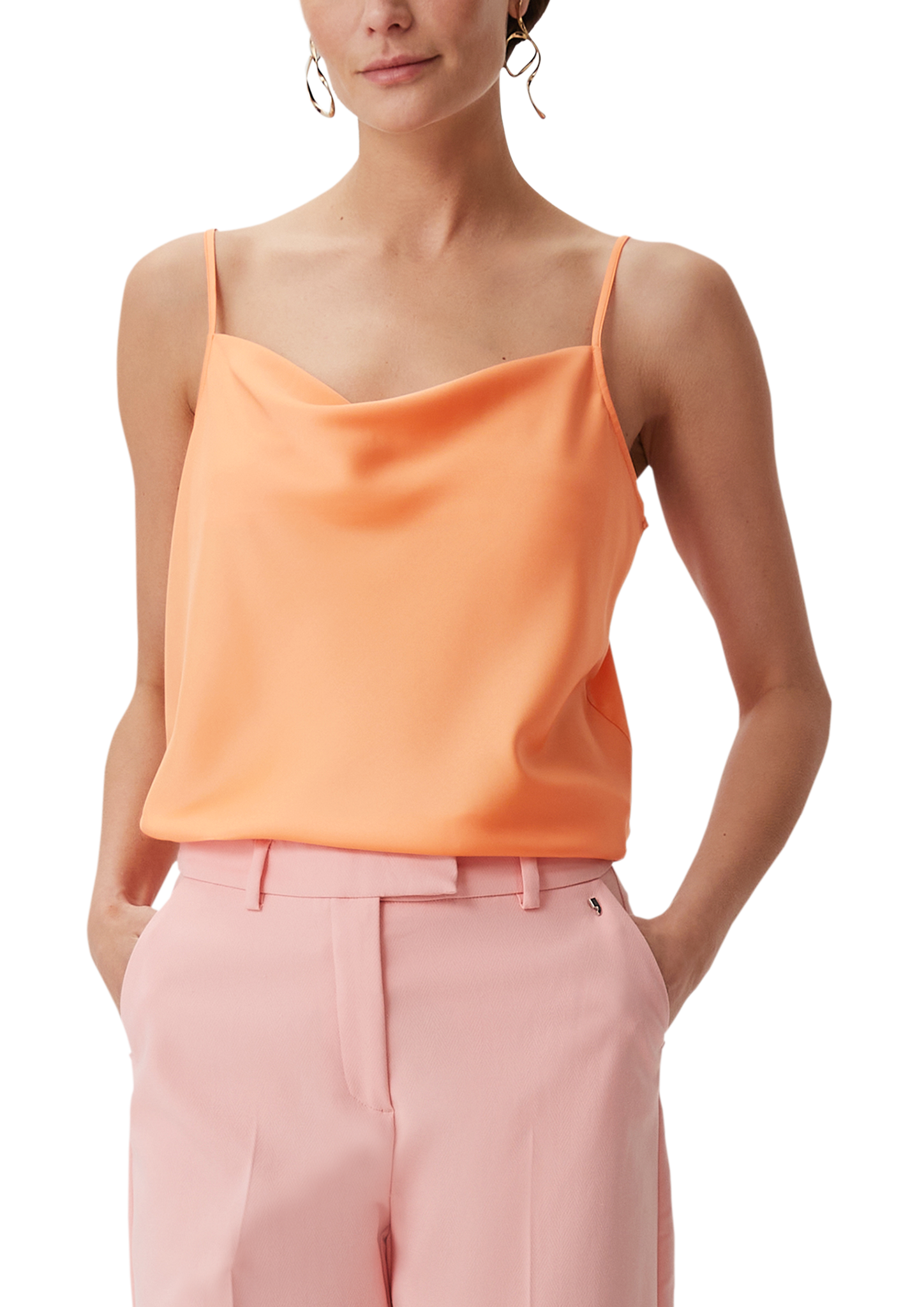 Lässig-elegantes Satintop für modische Looks. Das figurumspielende Trägertop aus weichem Satin verleiht Ihnen eine feminine Silhouette. Der Wasserfall-Ausschnitt und die längenverstellbaren Träger machen es zum perfekten Piece für festliche Anlässe. Stylen Sie es lässig mit Jeans oder edel mit Midikleid – dieses modische Oberteil ist ein vielseitiger Allrounder.