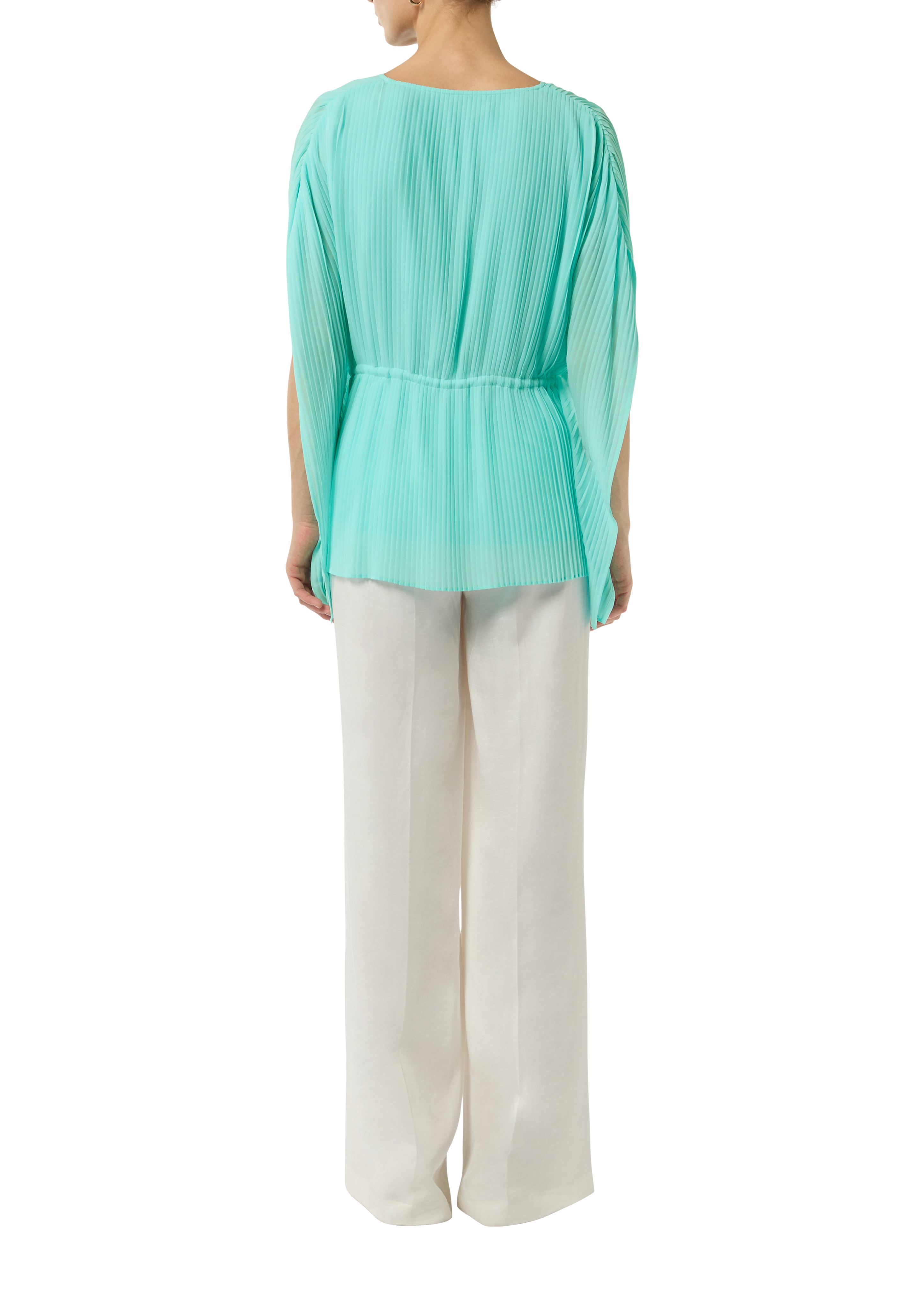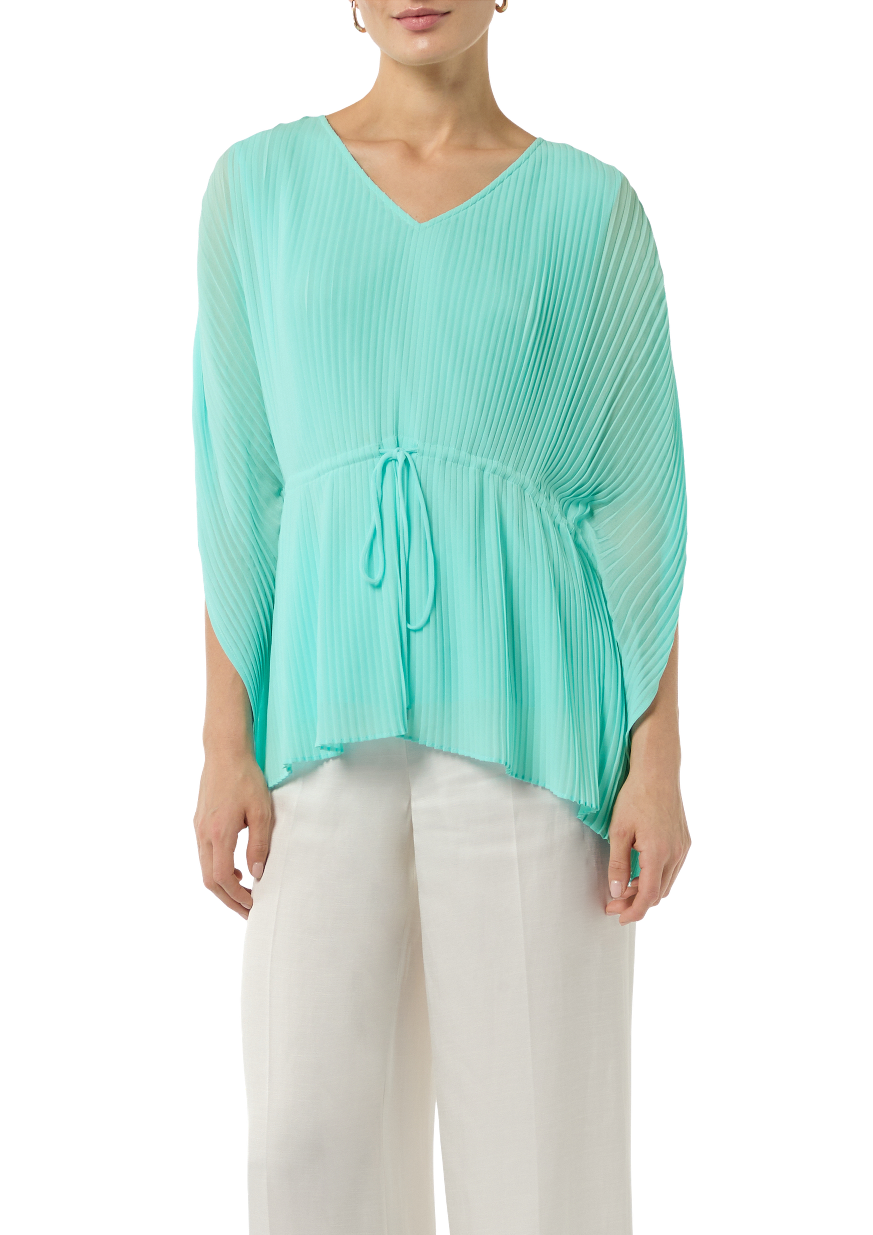 Lässige Eleganz im Plissee-Look: Diese fließende Tunika mit V-Ausschnitt und überschnittenen Schultern umspielt Ihre Silhouette gekonnt. Aus feiner Qualität gefertigt, sorgt sie für luftigen Tragekomfort an warmen Tagen. Stylen Sie die Bluse lässig mit Jeans oder Chino-Hose für einen entspannten Casual-Look. #todayfortomorrow