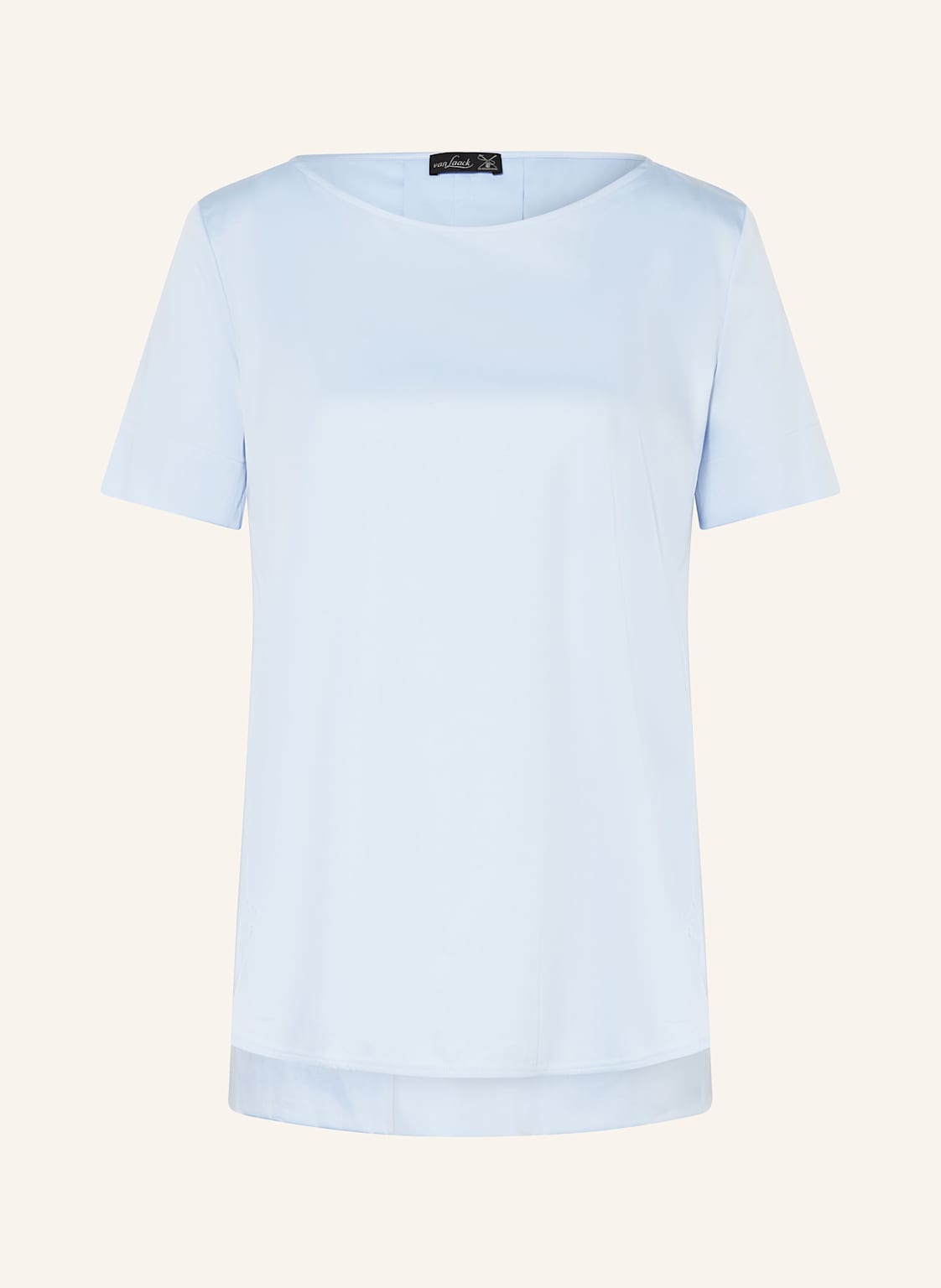 Glattstrick. Gerader Schnitt. V-Ausschnitt. Überschnittene Schultern. Label-Detail auf der Rückseite. Flaum. Weiche Haptik