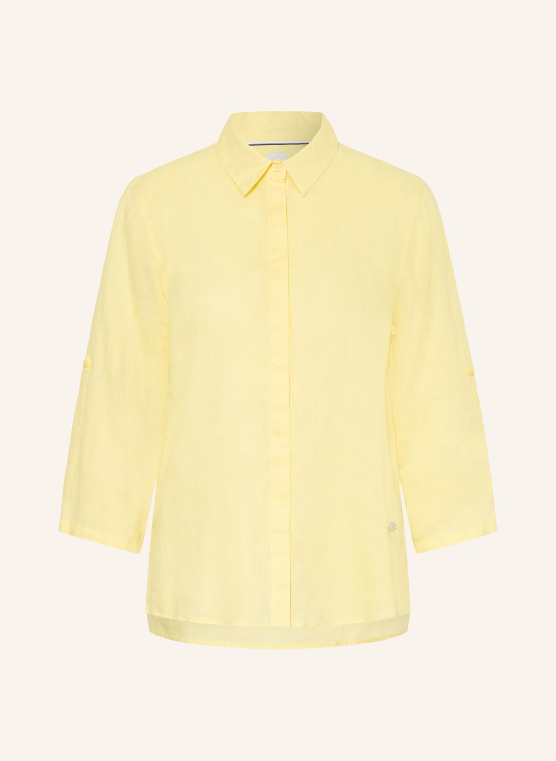 3/4-Ärmel. Gerader Schnitt. Fixierbare Ärmel mit Knopf und Riegel. Seitenschlitze. Hemdblusenkragen. Aus Leinen. Unifarben. Verlängerte Rückenpartie. Breite Rückenpasse. Quetschfalte auf der Rückseite. Durchgehende Knopfleiste