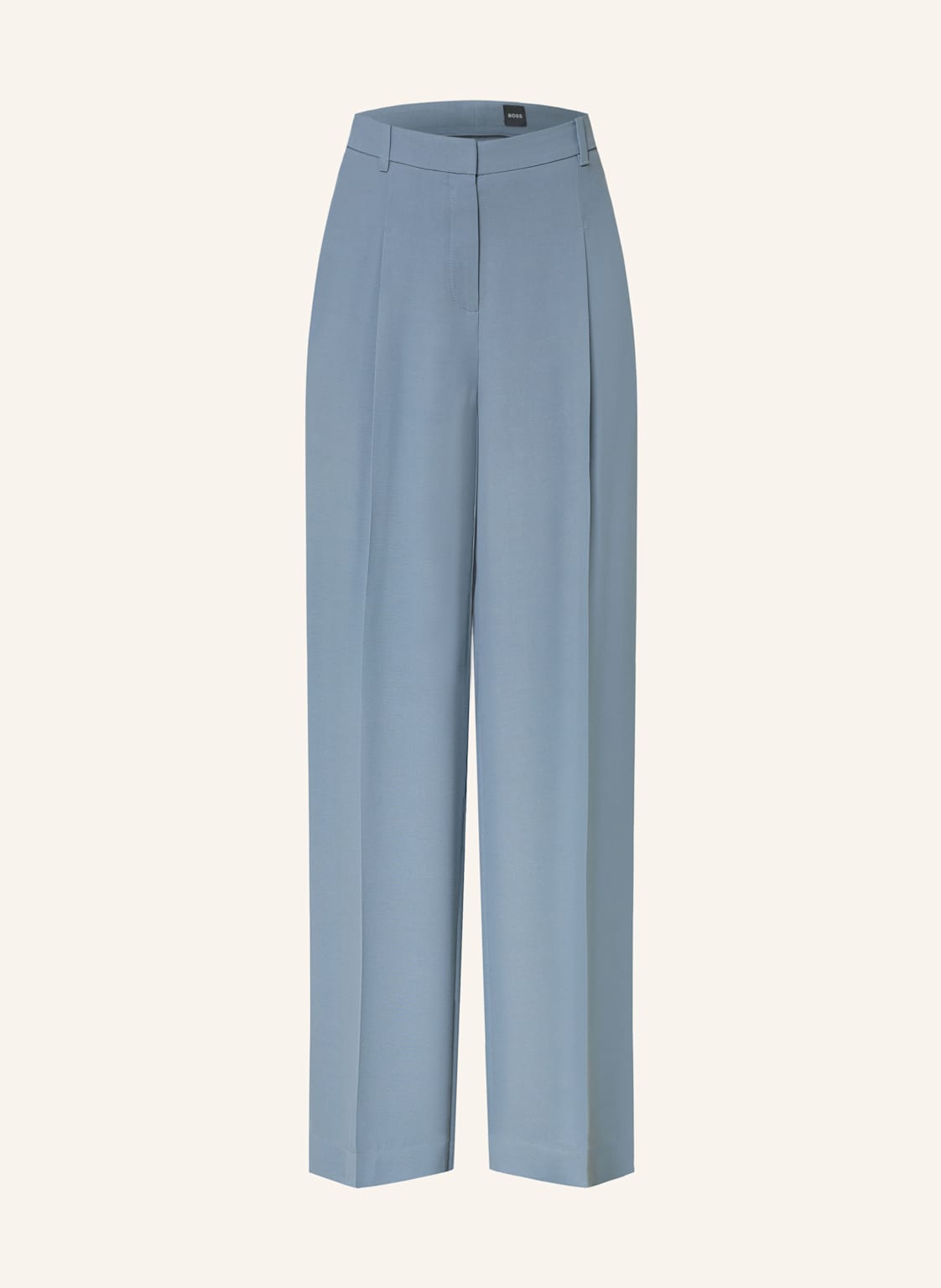 Normale Leibhöhe. Elastischer Bund. Schmal zulaufendes Bein. Seitenschlitze. Unifarben. Seitliche Eingrifftaschen. Dekorative Gesäßtasche. Knopf-, Haken- und Reißverschluss. Bügelfalten. Leichte Haptik. Elastische Qualität