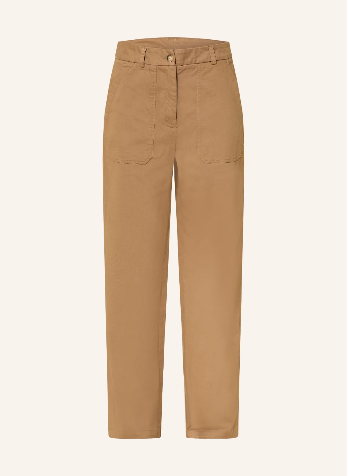 Hohe Leibhöhe. Gerades Bein. Gürtelschlaufen. Feste Haptik. Aus Baumwolle. Unifarben. Cargotasche. Seitliche Eingrifftaschen. Gesäßtaschen. Knopf und Reißverschluss