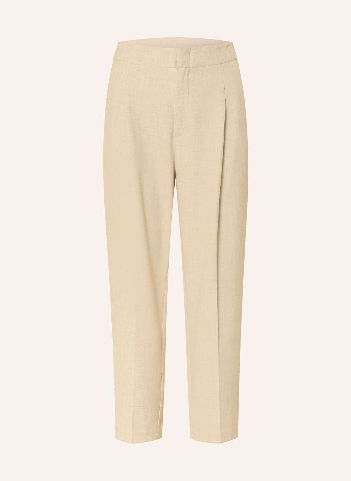 Hohe Leibhöhe. Verstellbarer Bund. Schmal zulaufendes Bein. Verkürztes Bein. Label-Detail. Unifarben. Melierte Optik. Seitliche Eingrifftaschen. Gesäßtaschen. Haken und Reißverschluss. Bundfalten. Bügelfalten. Feste Haptik. Elastische Qualität. Twill-Struktur
