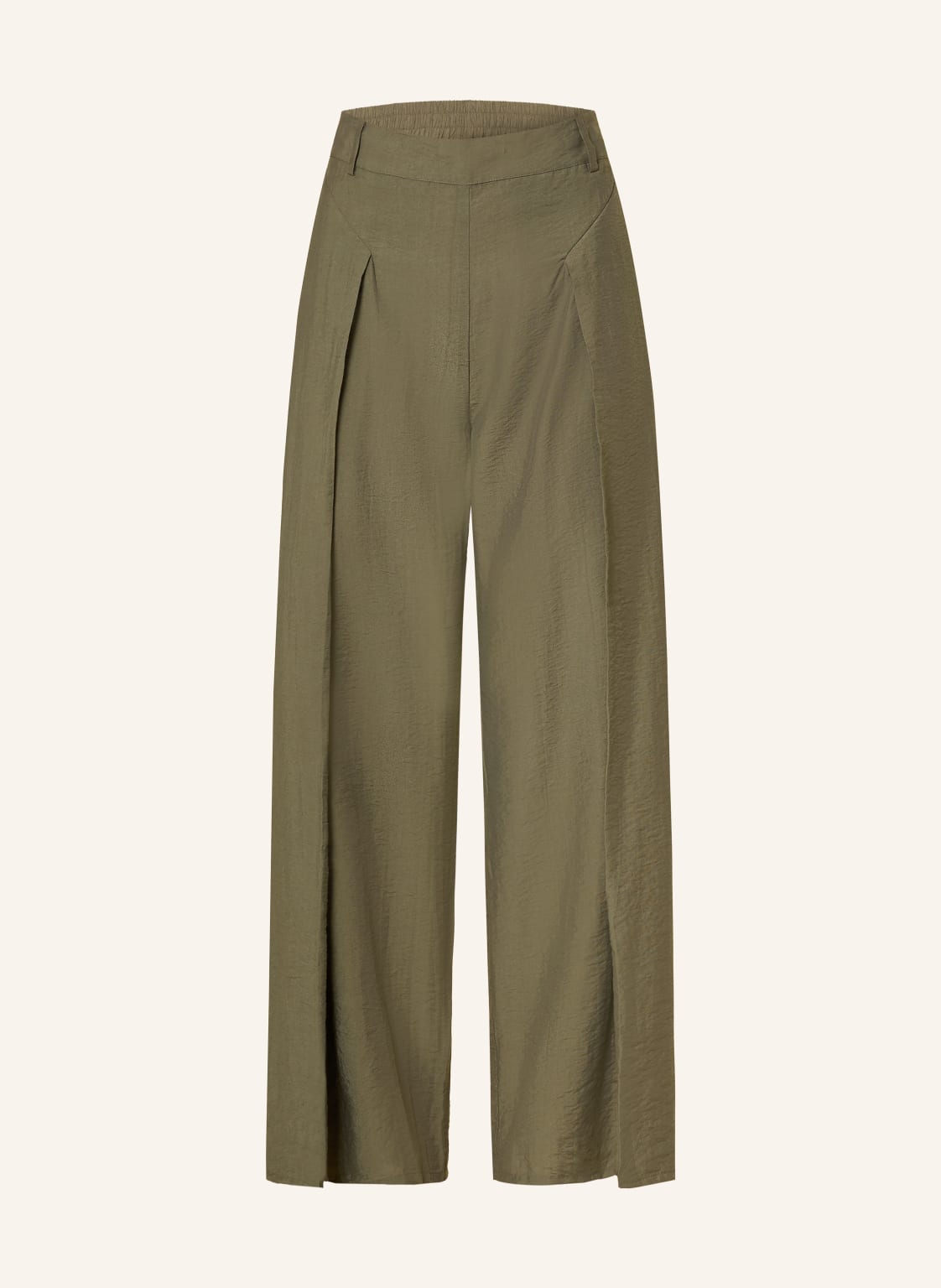 Hohe Leibhöhe. Elastischer Bund. Gerades Bein. Weites Bein. Label-Detail. Unifarben. Seitliche Eingrifftaschen. Verschlusslos. Bundfalten. Bügelfalten. Strukturierte Haptik. Crinkle-Qualität