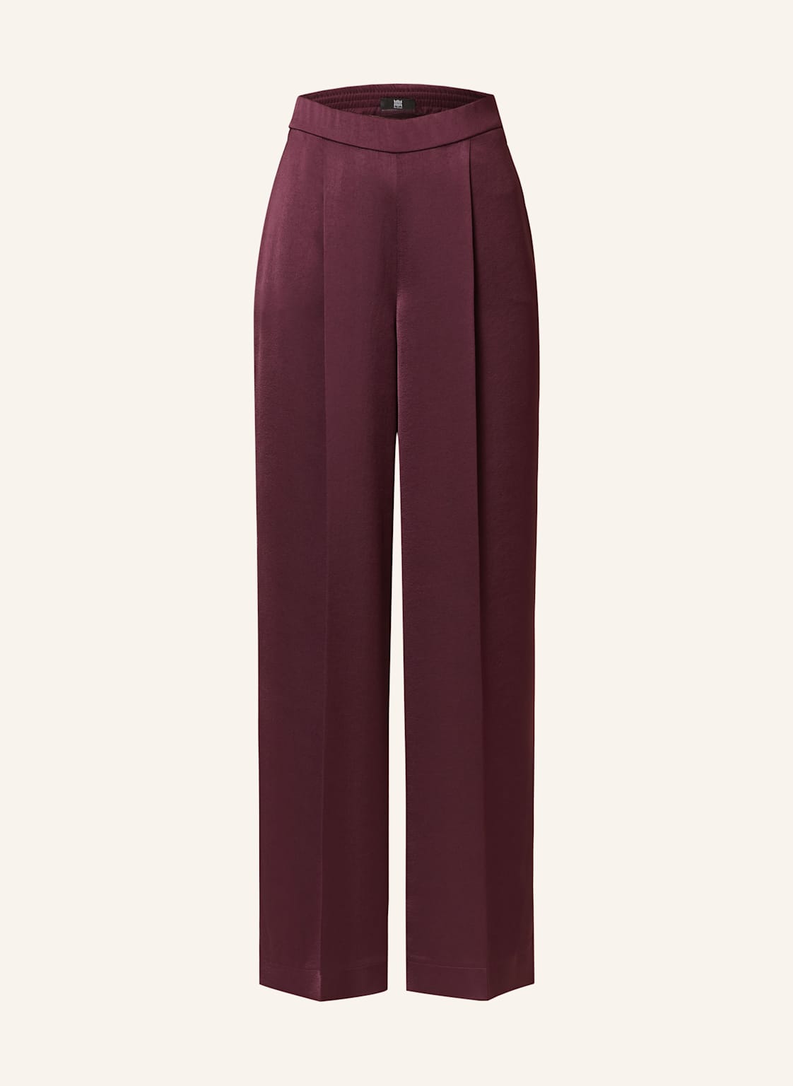 Hohe Leibhöhe. Elastischer Bund. Gerades Bein. Weites Bein. Unifarben. Seitliche Eingrifftaschen. Seitlicher Reißverschluss und Häkchen. Bundfalten. Bügelfalten. Glatte Haptik. Weiche Haptik