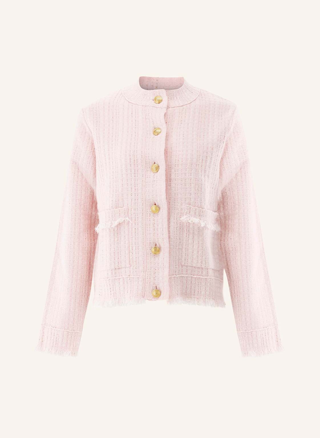 Diese semi-taillierte, kurz geschnittene Jacke aus gestricktem Tweed überzeugt durch hochwertige Verarbeitung und edle Details. Lange Ärmel und ein Stehkragen sorgen für eine klare Silhouette, während goldfarbene Knöpfe und zwei aufgesetzte Taschen elegante Akzente setzen. Das Mischgewebe mit Baumwolle und Stretch bietet Tragekomfort und leichte Elastizität. Vielseitig kombinierbar, eignet sich die Jacke ideal für stilvolle Casual- oder Business-Casual-Looks mit femininer, moderner Ausstrahlung.Taillierter Schnitt Kurz geschnitten Gestrickter Tweed Unser Model (1,76 m) trägt Größe 36. Langer Ärmel. Keine Manschette