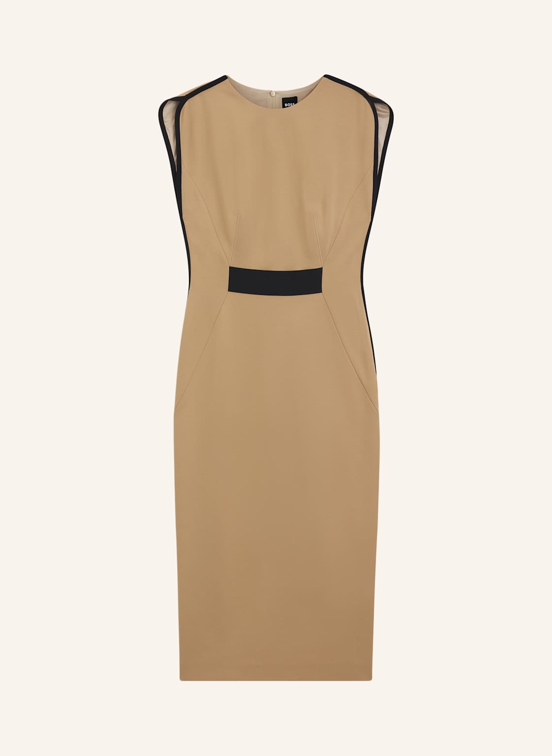 Mit transparenten Partien und Feinripp ist das figurbetonte HUGO Kleid aus softem Krepp gefertigt. Stack-Logo-Akzent. Stehkragen. Slim Fit. Mock-Neck. Ärmellos. Rückenlänge: 123 cm