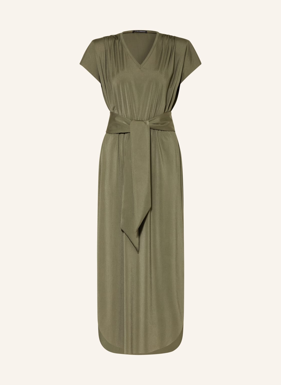 Kurze Ärmel. Ausgestellter Rockteil. Taillierter Schnitt. Angeschnittene Ärmel. V-Ausschnitt. Seitenschlitze. Abnehmbarer Gürtel. Unifarben. Herausnehmbare Schulterpolster. Elastischer Taillenbund. Ungefütterte Verarbeitung. Glatte Haptik. Jerseyqualität
