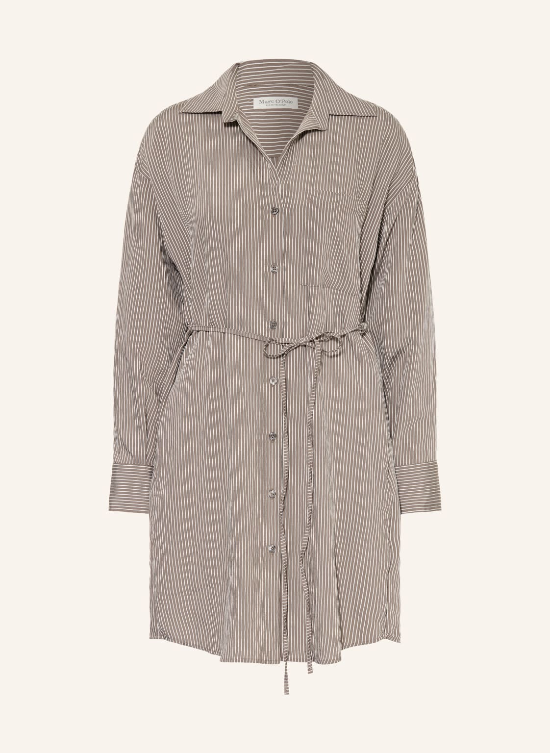 Lange Ärmel. Gerader Schnitt. Überschnittene Schultern. Abnehmbarer Gürtel. Hemdblusenkragen. Zweiknopf-Manschetten. Streifenmuster. Seitliche Eingrifftaschen. Breite Rückenpasse. Quetschfalte auf der Rückseite. Durchgehende Knopfleiste. Glatte Knopfleiste. Ungefütterte Verarbeitung. Strukturierte Haptik