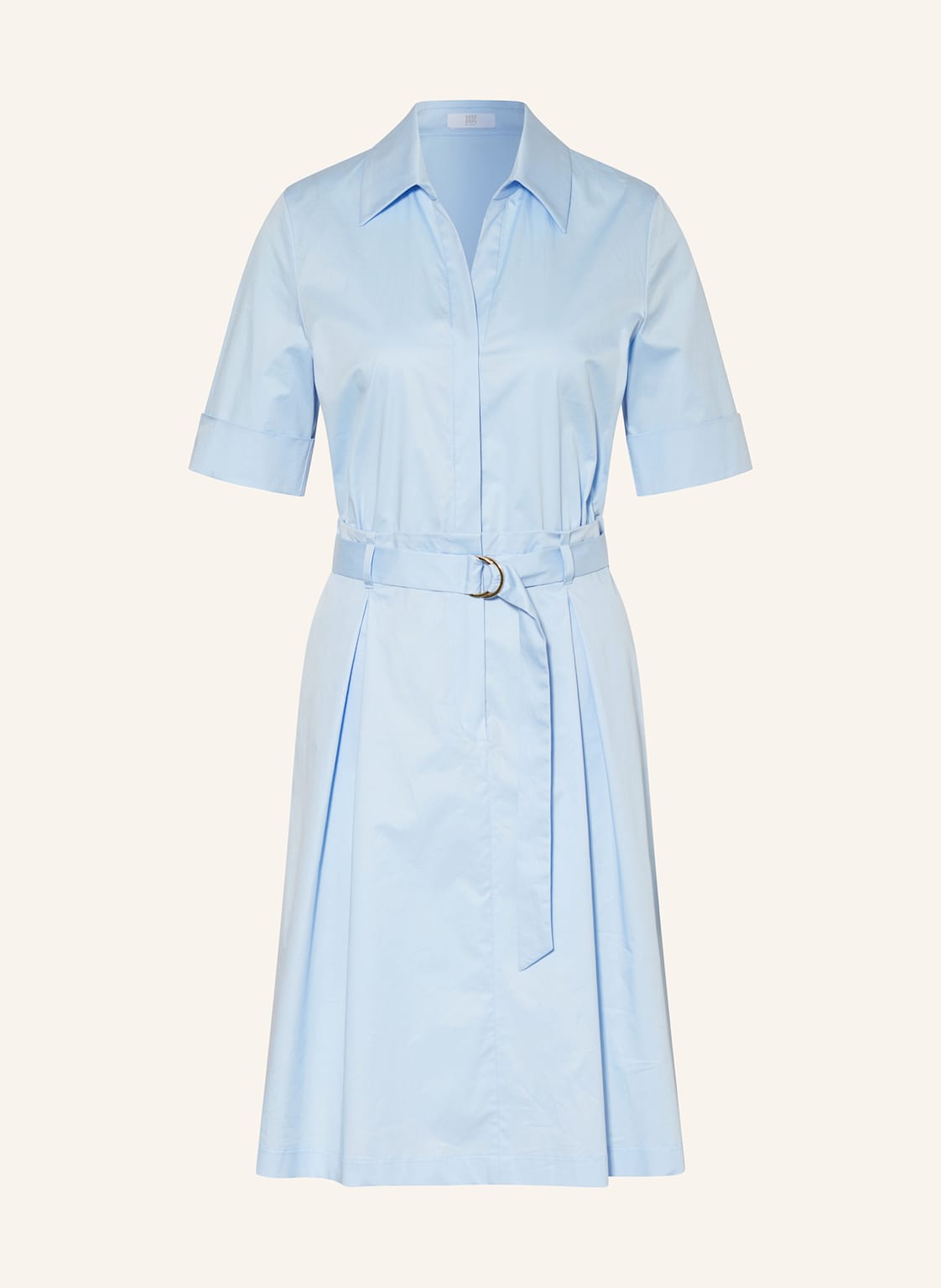 Taillierter Schnitt mit leicht ausgestelltem Rockteil. Hemdblusenkragen. Schließt mit verdeckter Knopfleiste und Reißverschluss. Kurze Ärmel. Fixierte Umschläge an den Ärmelenden. Mit abnehmbarem Gürtel und Gürtelschlaufen. Eingrifftaschen. Ungefütterte Verarbeitung. Faltenlegung am Rockteil. Elastische Baumwollqualität