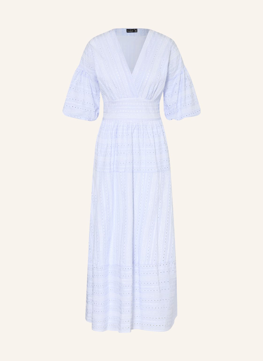 Kurze Ärmel. Ausgestellter Rockteil. Taillierter Schnitt. Elastische Bündchen an den Ärmelenden. Ballonärmel. Cache-Cœur-Ausschnitt. Aus Baumwolle. Nadelstreifen. Fixiertes Taillenband. Seitliche Eingrifftaschen. Nahtfeiner Reißverschluss in der Seite. Gefütterte Verarbeitung. Lochspitze