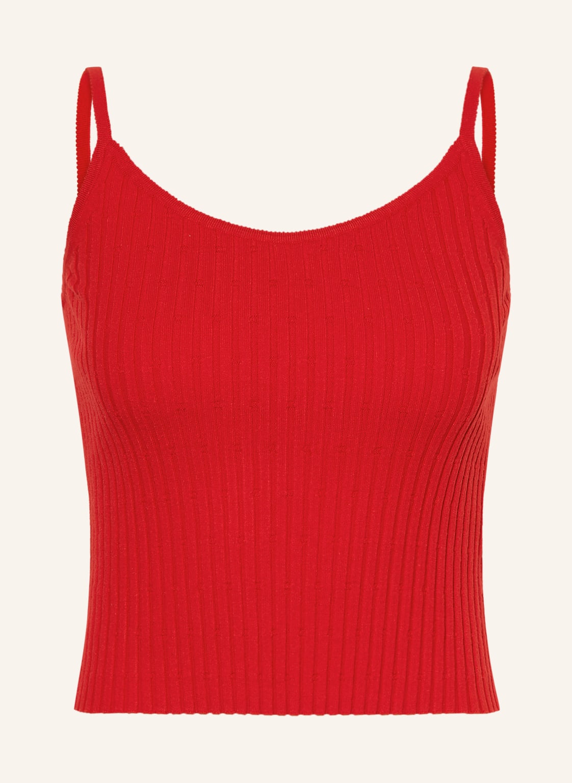 Ärmellos. Enganliegender Schnitt. Rundhalsausschnitt. Unifarben. Rippstrick. Spaghetti-Träger. Weiche Haptik