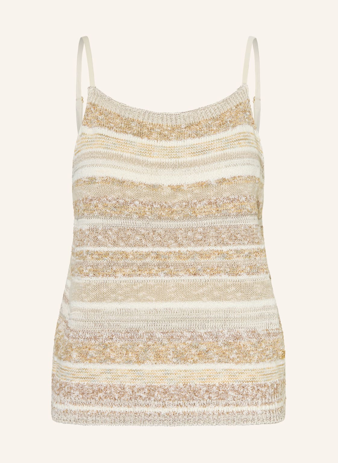 Ärmellos. Gerader Schnitt. Karree-Ausschnitt. Label-Detail. Aus Baumwolle. Streifenmuster. Rippbündchen am Saum. Glattstrick. Spaghetti-Träger. Verstellbare Träger. Verschlusslos. Strukturierte Haptik