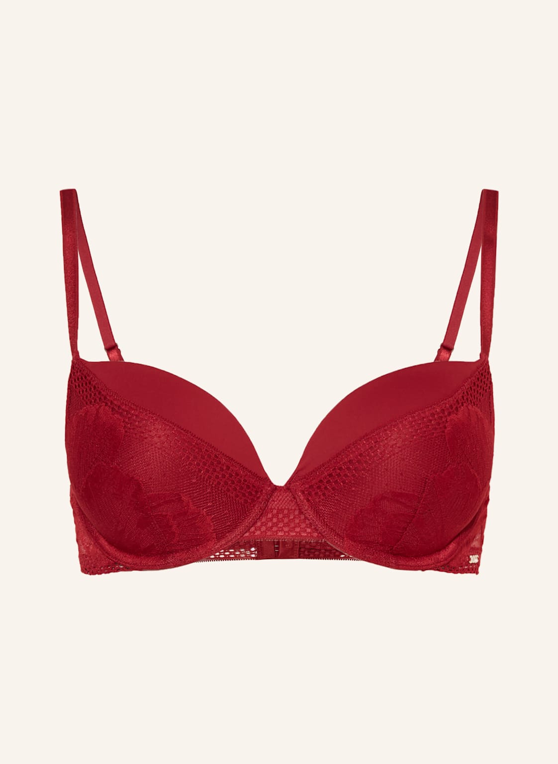 Push-up-Cups. Integrierte Bügel. Ohne seitliche Formstäbchen. Schmaler Steg. Verstellbare Spaghetti-Träger. Hinten in vier Stufen mithilfe zweier Ösen verstellbar. Transparente Seitenteile und transparentes Rückenteil. Blickdichte Verarbeitung an den Körbchen. Spitzenverarbeitung. Metallische Logo-Applikation