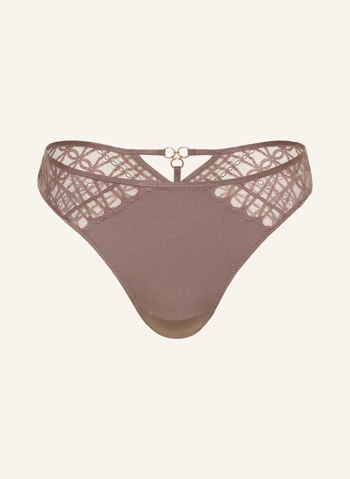 Blickdichte Verarbeitung vorne. Transparente Seitenteile und transparentes Rückenteil aus Spitze. Hüfthoher Bund. Gerader Beinausschnitt. Mittige Teilungsnaht hinten. Baumwollzwickel. Vollständige Bedeckung des Pos. Roségoldfarbene Metalldetails. Cut-outs hinten