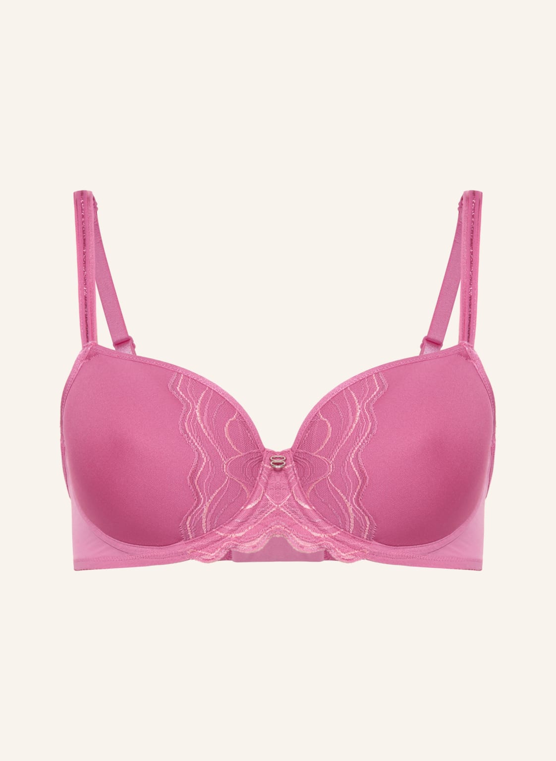 Spacer-Cups. Wattierte Cups. Ohne seitliche Formstäbchen. Silberfarbene Metalldetails. Grafisches Muster. Verstellbare Träger. Blickdichte Verarbeitung. Zwei Ösen. Hinten in drei Stufen verstellbar. Spitzenbesatz. Stickereien