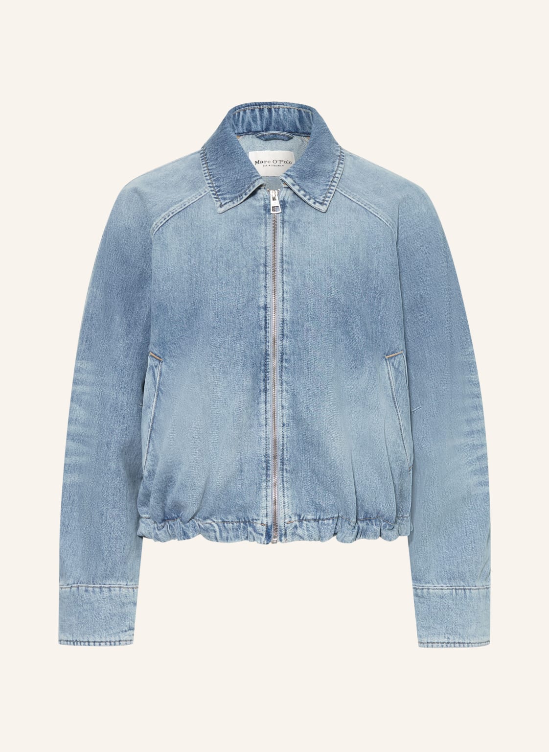 Lange Ärmel. Gerader Schnitt. Raglanärmel. Umlegekragen. Knopflose Manschetten. Aus Baumwolle. Unifarben. Used-Optik. Leistentaschen. Tunnelzug am Saum. Tunnelzug mit Kordelstopper. Reißverschluss. Ohne Innenfutter. Weiche Haptik. Denim-Qualität