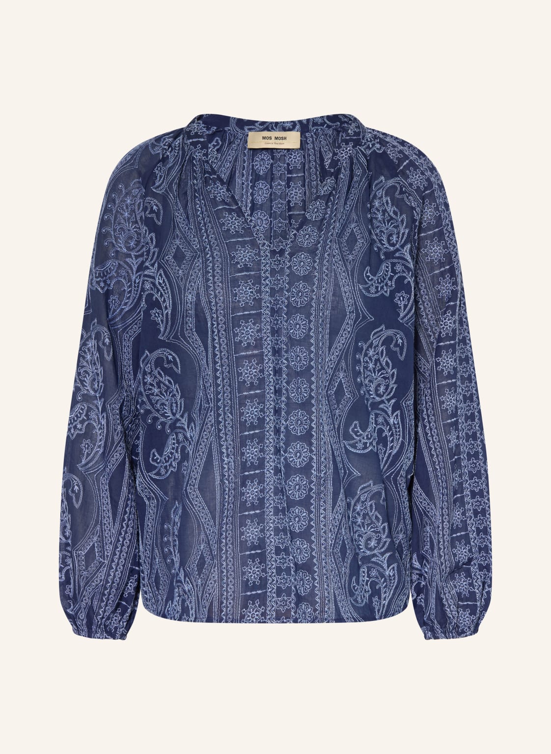 Lange Ärmel. Gerader Schnitt. Elastische Bündchen an den Ärmelenden. Ballonärmel. Tunika-Ausschnitt. Label-Detail. Paisley-Muster. Semitransparente Optik. Stickereien. Raffungen. Leichte Haptik