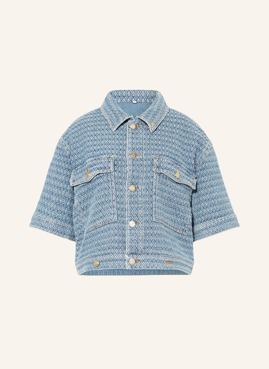 Kurze Ärmel. Kastenförmiger Schnitt. Umlegekragen. Allover-Muster. Geknöpfte Pattentaschen. Breite Rückenpasse. Durchgehende Knopfleiste. Strukturierte Haptik. Aus Baumwolle. Jacquard-Qualität. Weitenverstellbarer Saum