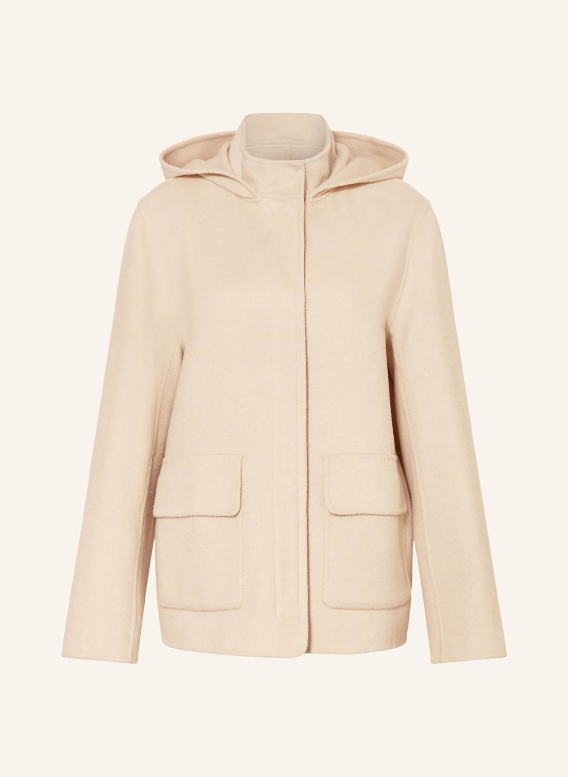 Gerader Schnitt. Stehkragen. Mit Kapuze. Schließt mit verdeckter Knopfleiste. Pattentaschen. Ohne Innenfutter. Weiche Haptik. Mit Wolle