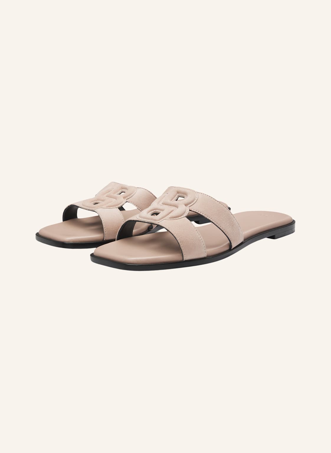 Vervollständige deinen Sommer-Look mit den soften Slides aus Veloursleder und dem gestickten Double-B-Monogramm von BOSS. Laufsohle aus Leder. Gepolsterte Innensohle. Eckige Kappe. Verschluss oben: Slip-on. Mit Innenfutter. Verpackung: Box