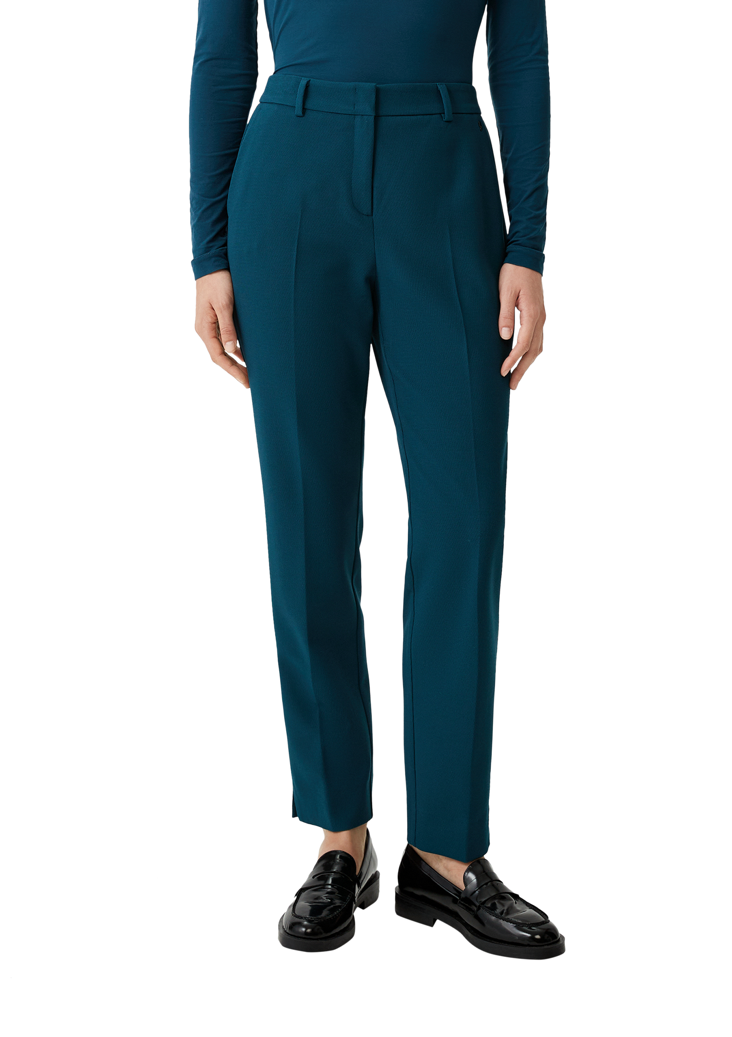 Lassen Sie sich von der exklusiven Slim Fit Hose aus hochwertiger Dobby-Struktur verzaubern. Der seitlich geschlitzte Saum und die Bootcut-Passform verleihen Ihnen eine feminine Silhouette. Dank des Mid-Rise-Bundes und der Ankle-Länge erhalten Sie einen eleganten Business-Look, den Sie mühelos auf- oder abwerten können.