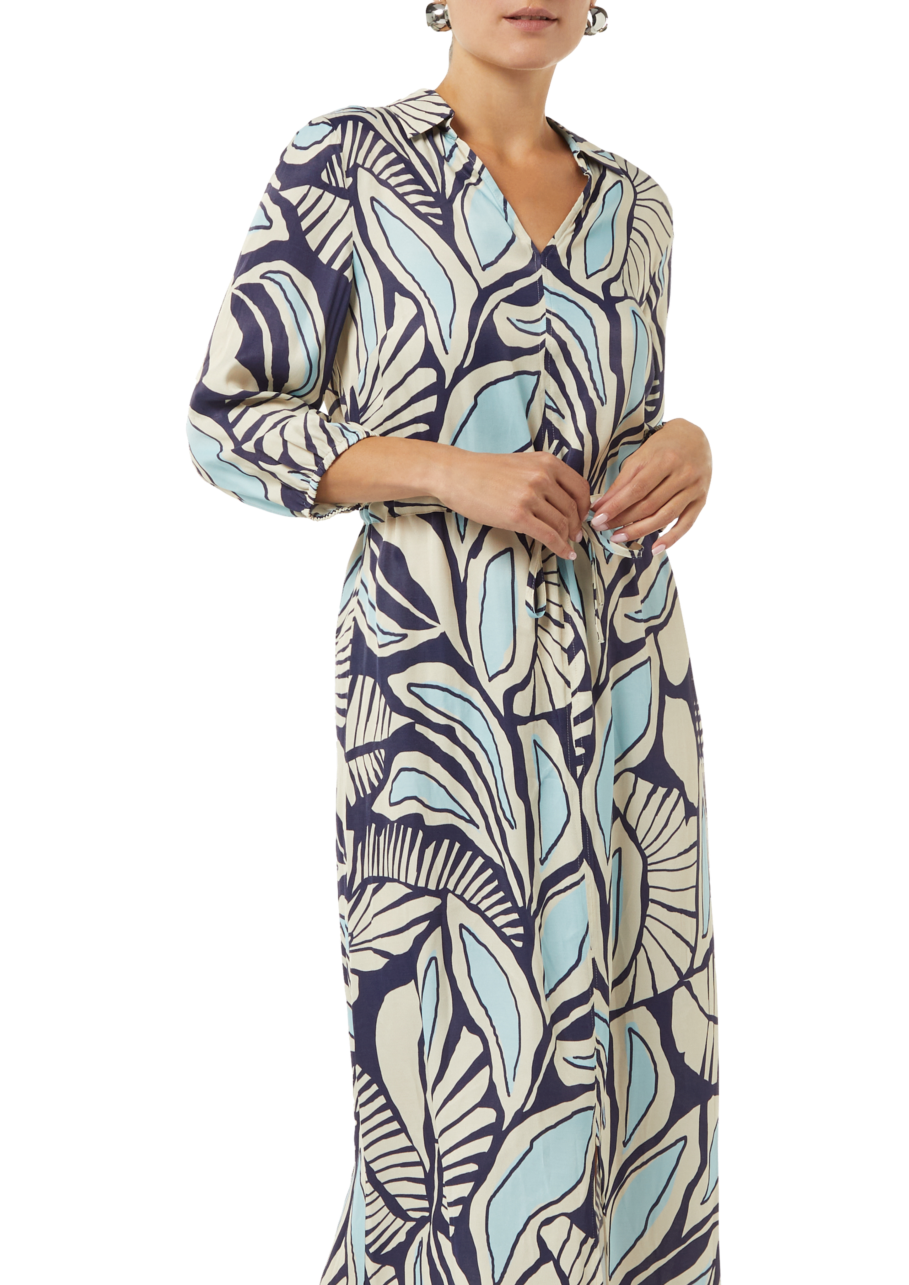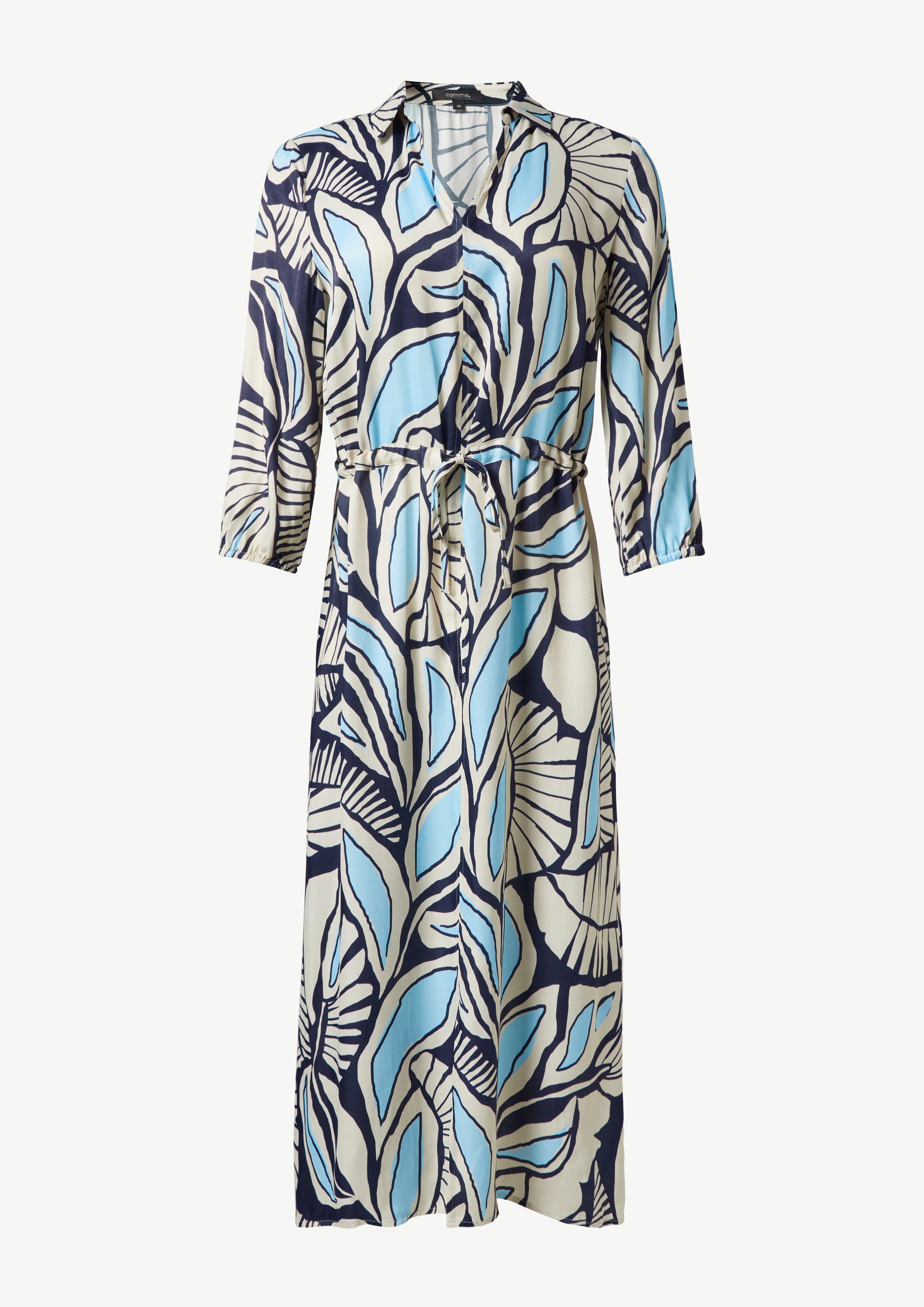Entdecken Sie feminine Eleganz mit unserem gemusterten Hemdblusenkleid aus fließender Viskose. Der V-Ausschnitt und 3/4-Ärmel verleihen Ihnen eine raffinierte Note, während der Tunnelzug Ihre Silhouette schmeichelhaft betont. Perfekt für Business und Freizeit – stylen Sie es mit Pumps für einen eleganten Auftritt oder mit Sneakers für einen lässigen Look. Die Midi-Länge macht es zum vielseitigen Begleiter für jede Gelegenheit.