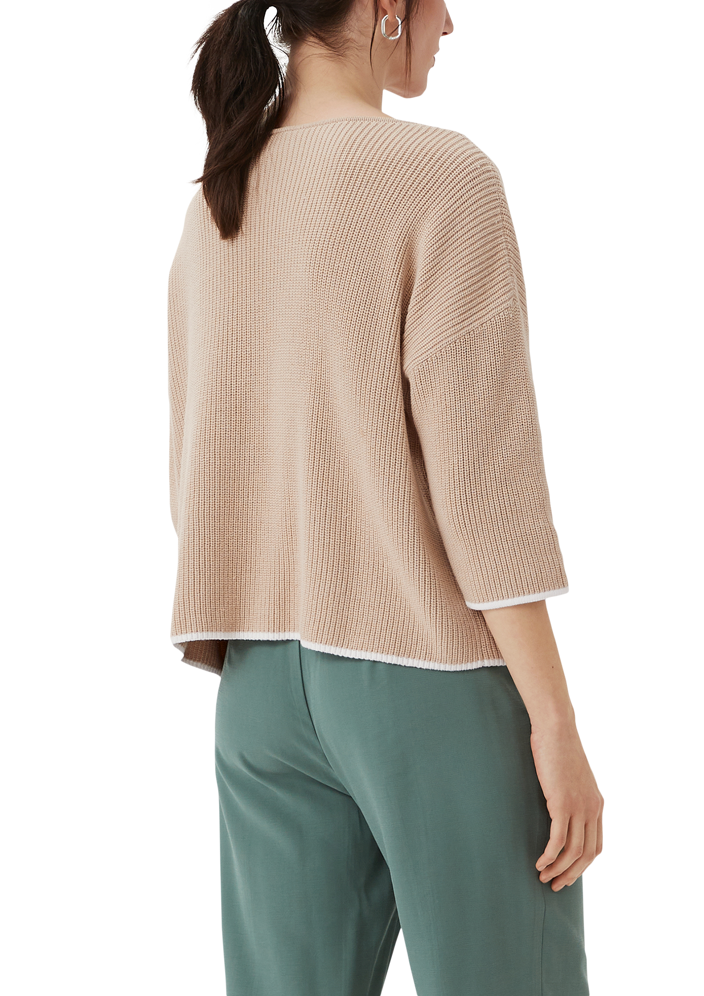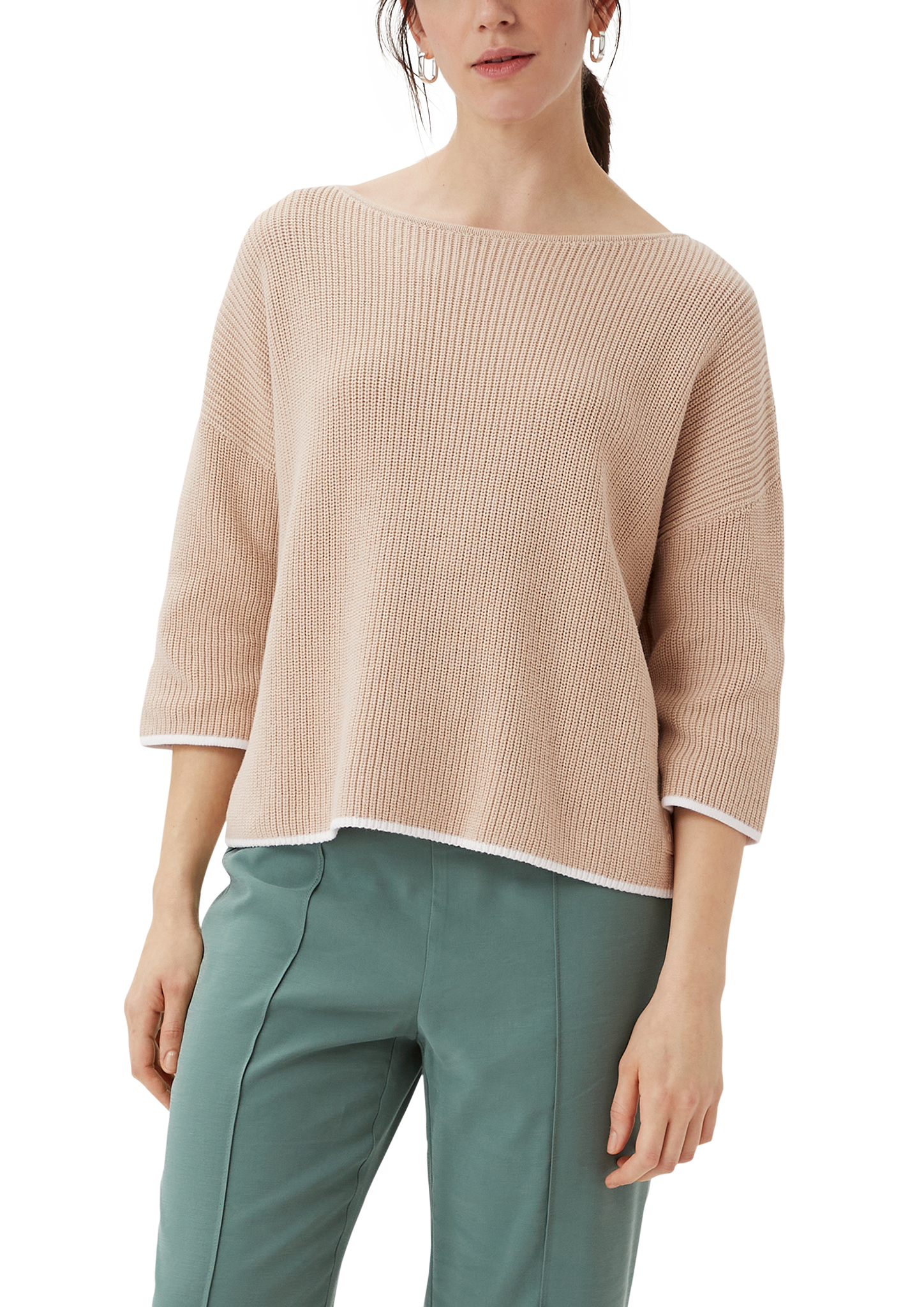 Strickpullover mit Kontrast-Details: Dieser bequeme Baumwollpullover umschmeichelt Ihre Silhouette mit seinem lässigen Boxy-Fit. Die 3/4-Ärmel und der U-Boot-Ausschnitt verleihen ihm einen coolen Twist, während die Kontrast-Details den legeren Look auffrischen. Ob zu Jeans oder Rock, dieser Strickpullover macht jedes Casual-Outfit zum Hingucker. #todayfortomorrow