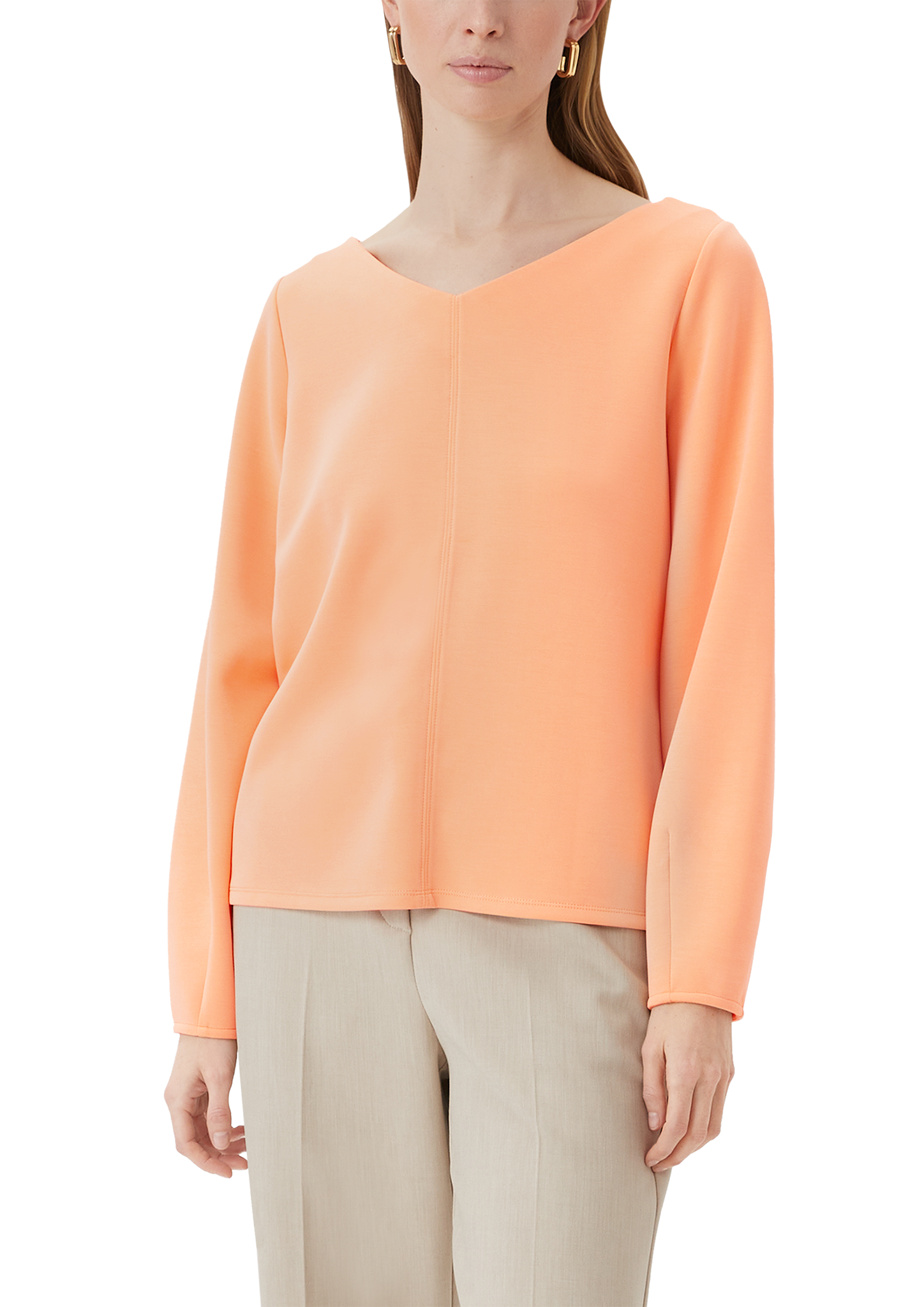 Lässiger Look für Casual-Tage: Das weiche Scuba-Sweatshirt mit V-Ausschnitt und langen Ärmeln umschmeichelt Ihre Silhouette. Der Regular Fit verleiht Ihnen Bewegungsfreiheit, während die feminine Passform Ihren Stil unterstreicht. Kombinieren Sie es mit Jeans für einen entspannten Auftritt oder stylen Sie es für kühle Abende im Layering-Look.