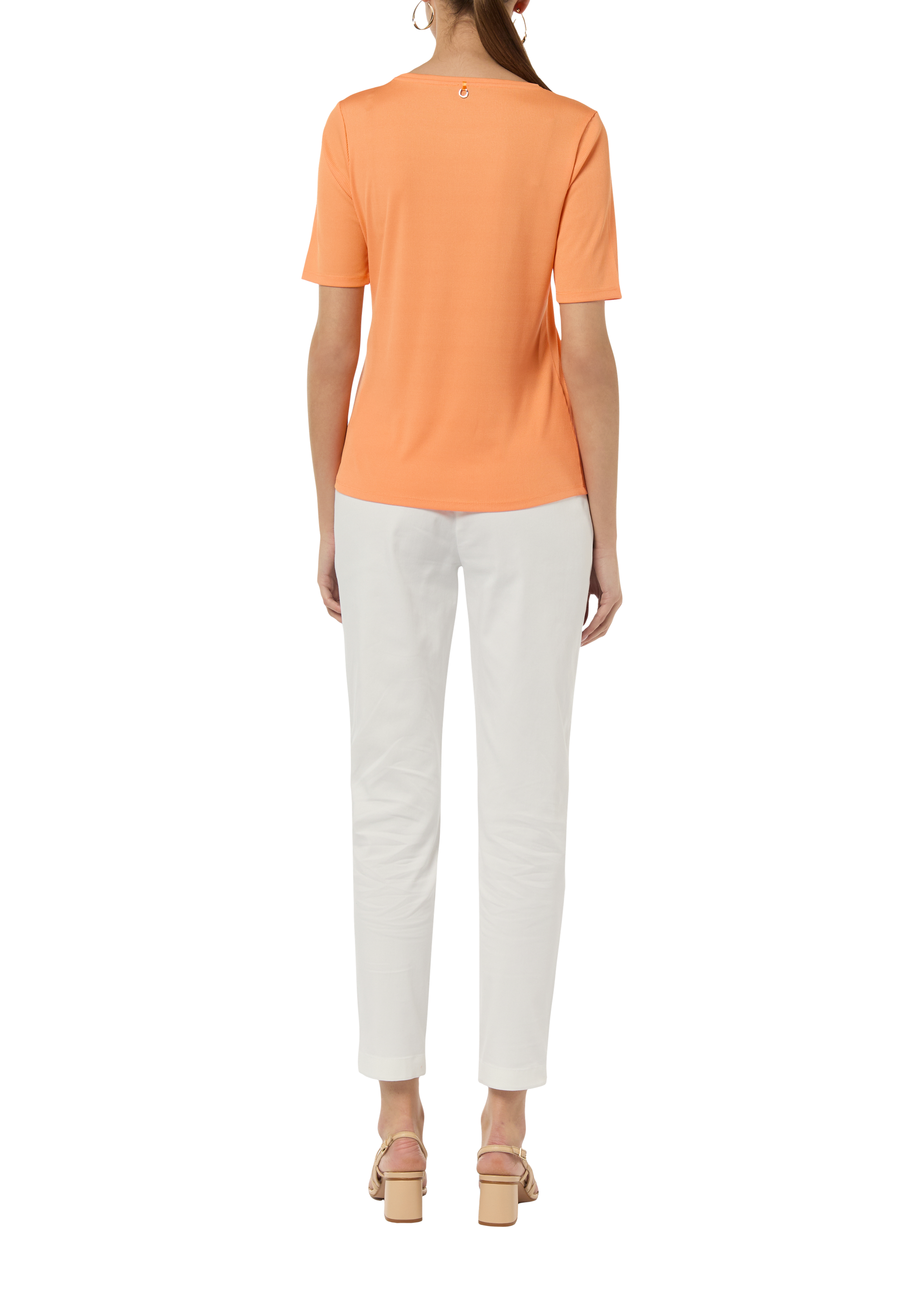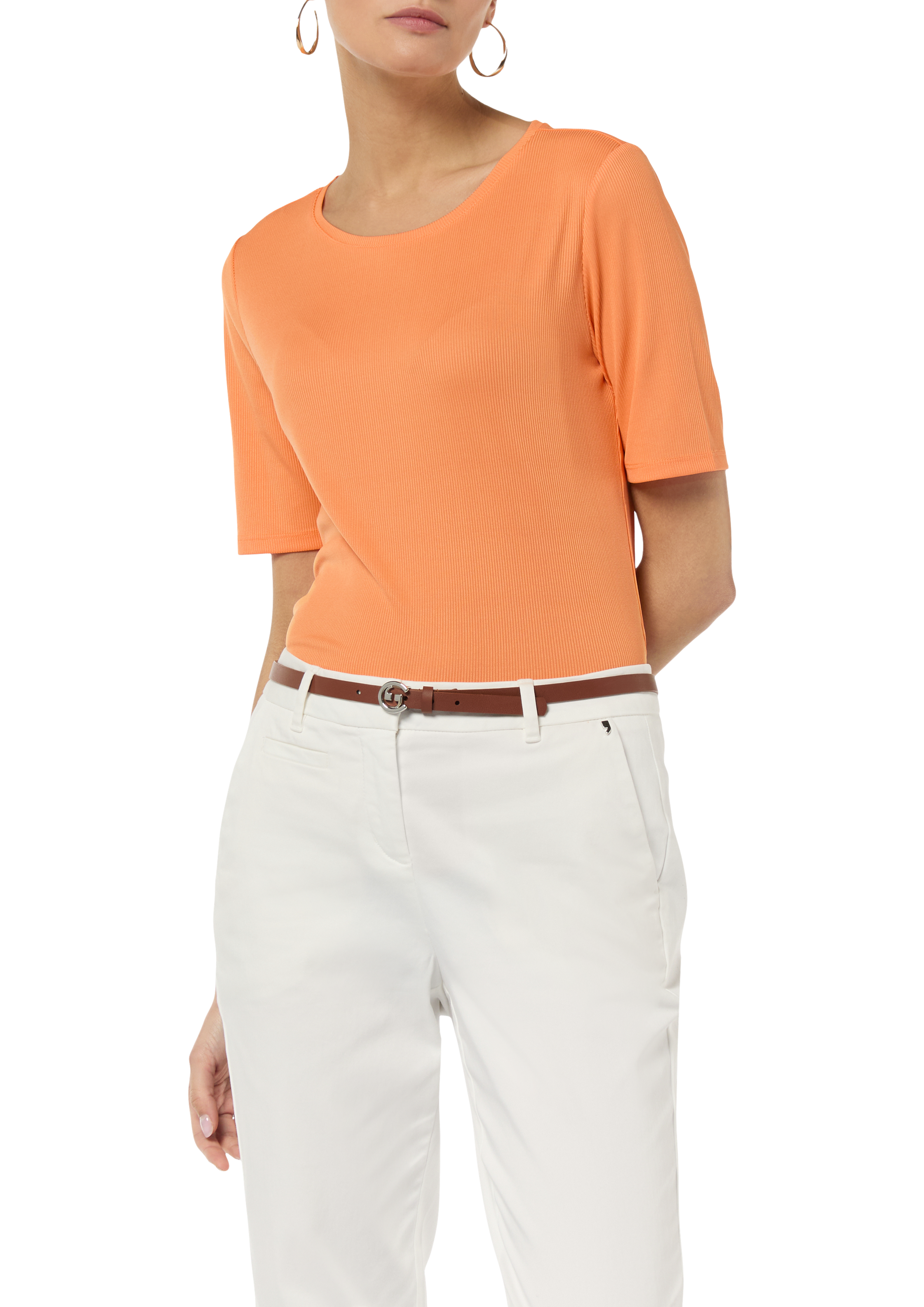 Schlichtes Design, feminine Silhouette: Das gerippte T-Shirt mit Rundhalsausschnitt avanciert zum Lieblingsteil. Die Slim Fit-Passform umschmeichelt Ihre Figur, während der cleane Look Kombinationsvielfalt verspricht. Ob lässig mit Jeans oder edel mit Rock, das fließende Oberteil aus kurzärmeliger Rippware lässt sich vielseitig stylen. Für Abkühlung an warmen Tagen sorgt das leichte Material.
